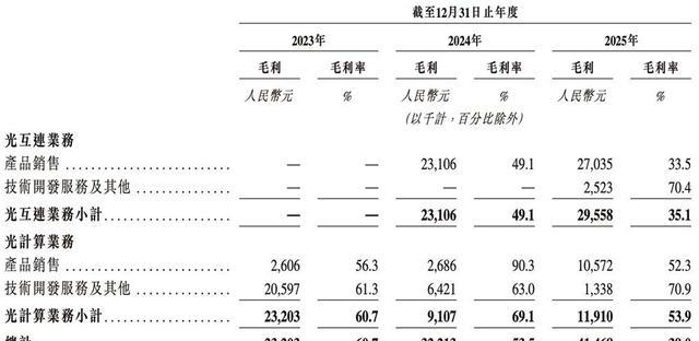 曦智科技毛利数据表 · 2023-2025年光互连、光计算业务毛利及毛利率