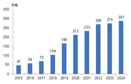 2015年-2024 年我国牛肉进口总量。(图/中国肉类协会)