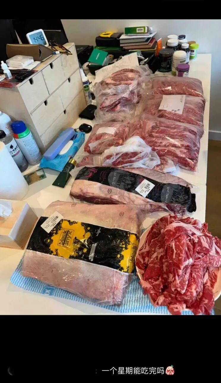 健身博主的50斤牛排囤货。(图/社交媒体截图)
